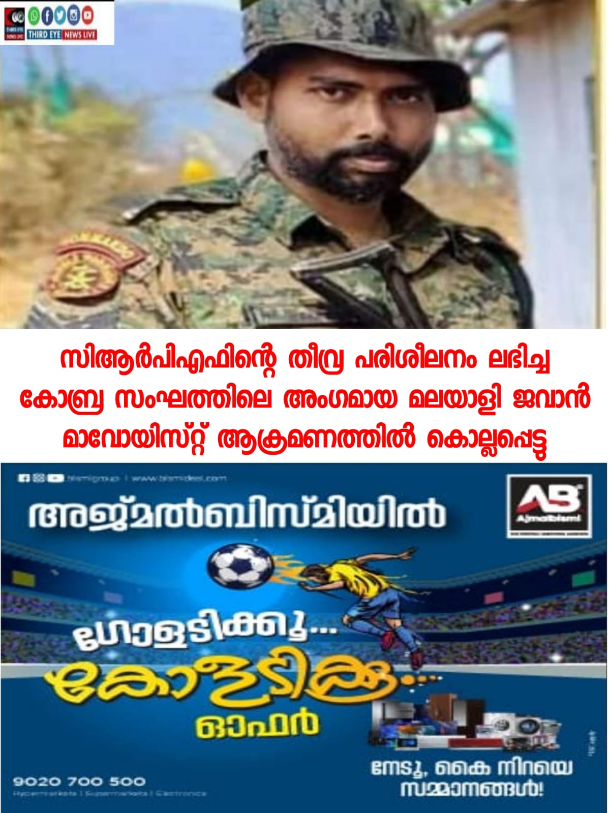 സിആർപിഎഫിന്റെ തീവ്ര പരിശീലനം ലഭിച്ച കോബ്ര സംഘത്തിലെ അംഗമായ മലയാളി ജവാൻ കൊല്ലപ്പെട്ടു; മുഹമ്മദ്‌ ഹക്കീം വീരമൃത്യു വരിച്ചത് ഛത്തീസ്‌ഗഡിൽ നടന്ന മാവോയിസ്റ്റ് ആക്രമണത്തിൽ