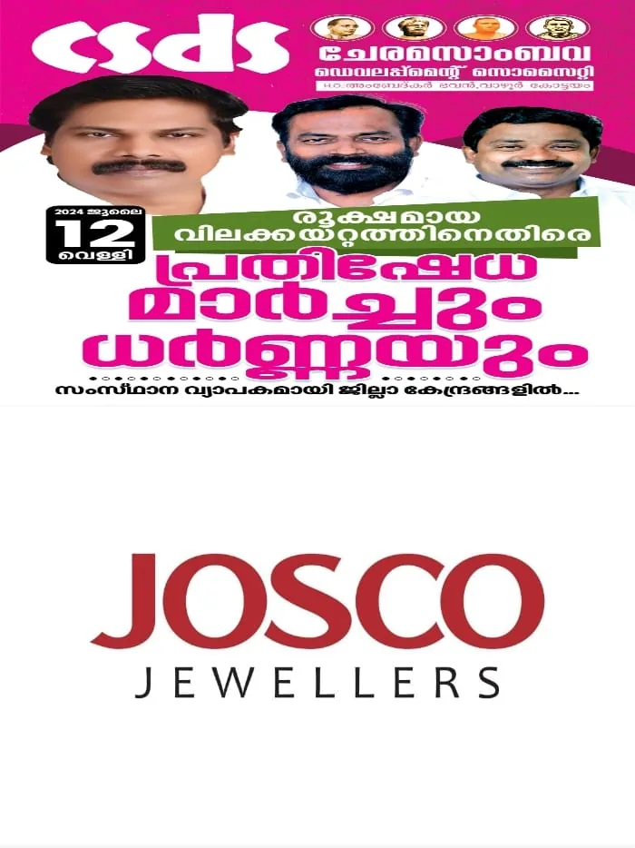 കോട്ടയം: രാജ്യത്ത് രൂക്ഷമായി തുടരുന്ന വിലക്കയറ്റത്തിനെതിരെ ചേരമസാംബാവ ഡെവലപ്മെന്റ് സൊസൈറ്റി (സി എസ് ഡി എസ് ) നേതൃത്വത്തിൽ ജില്ലാകേന്ദ്രങ്ങളിൽ മാർച്ചും ധർണ്ണയും വെള്ളി രാവിലെ 10 മുതൽ നടത്തുമെന്ന് സംസ്ഥാന പ്രസിഡണ്ട് കെ കെ സുരേഷ് ജനറൽ സെക്രട്ടറി സുനിൽകെ തങ്കപ്പൻ എന്നിവർ അറിയിച്ചു.