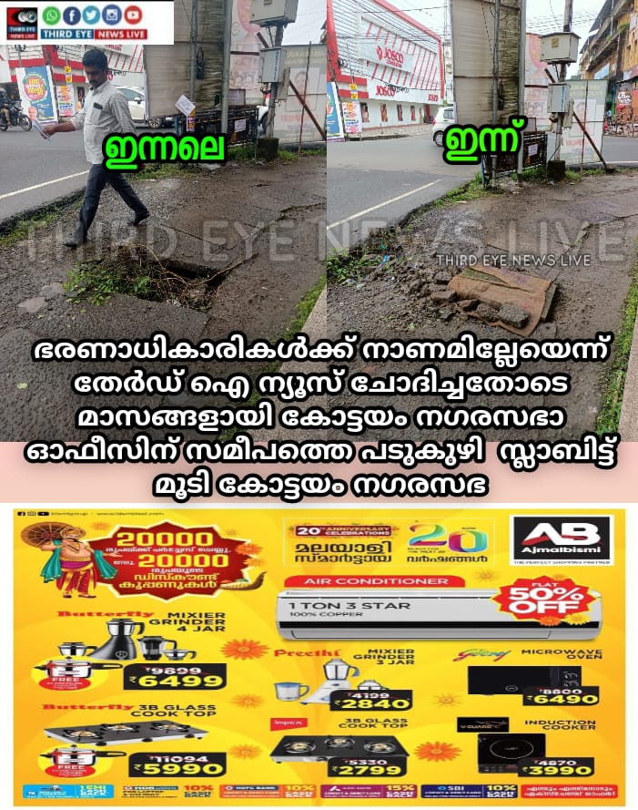 ഇതോടെയാണ് തേർഡ് ഐ ന്യൂസ് കുഴിയുടെ ചിത്രം സഹിതം വാർത്ത പ്രസിദ്ധീകരിച്ചത്. വാർത്ത പ്രസിദ്ധികരിച്ച് മണിക്കൂറുകൾക്കകം നഗരസഭാ അധികൃതർ കുഴി സ്ലാബിട്ട് മൂടി.