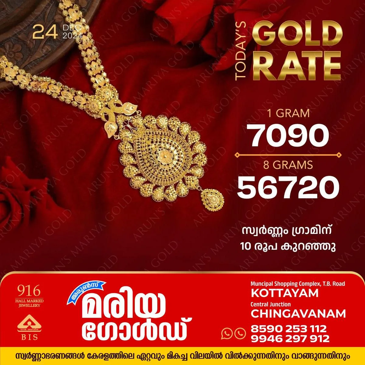 സ്വര്‍ണ വിലയിൽ ഇടിവ് ; അറിയാം കോട്ടയം അരുൺസ് മരിയാ ഗോൾഡിലെ സ്വർണ വില