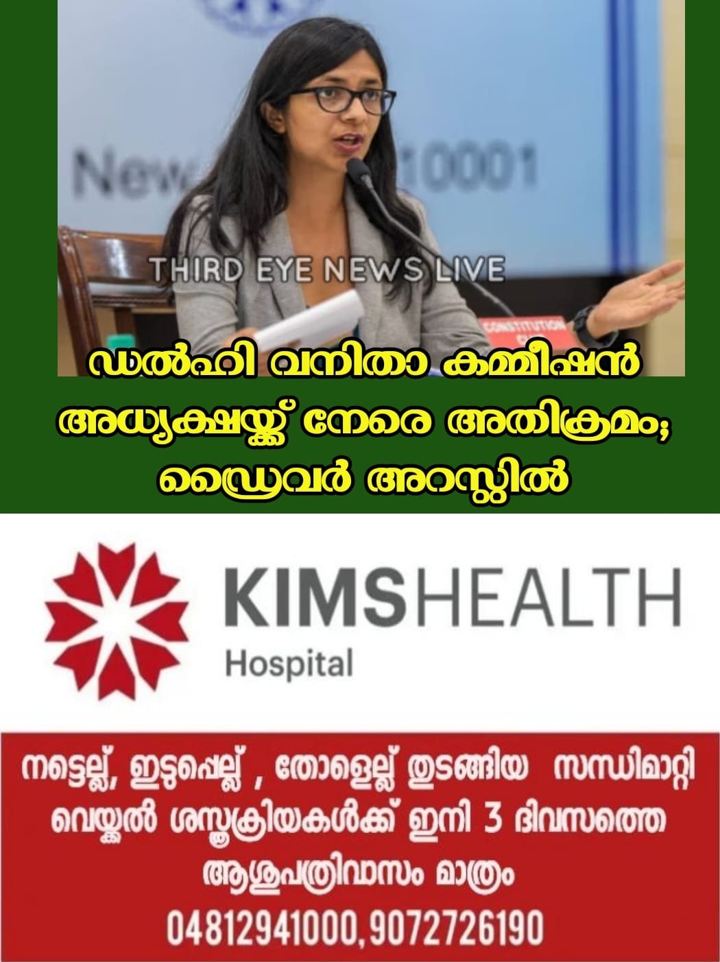 ഡല്‍ഹിയിലെ സ്ത്രീകളുടെ സുരക്ഷിതത്വവുമായി ബന്ധപ്പെട്ട പരിശോധനയ്ക്കിടയിൽ വനിതാ കമ്മീഷന്‍ അധ്യക്ഷ സ്വാതി മലിവാളിനു നേരെ അതിക്രമം; കൈ കാറില്‍ കുരുക്കി വലിച്ചിഴച്ചു; പ്രതി അറസ്റ്റിൽ