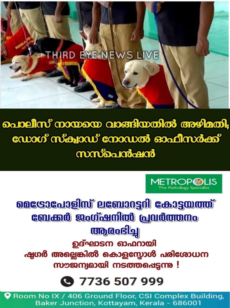 ഡോഗ് സ്ക്വാഡിന്റെ ചുമതലയുണ്ടായിരുന്ന നോഡല് ഓഫീസര് എഎസ് സുരേഷ് നായകള്ക്ക് വേണ്ട ഭക്ഷണം വാങ്ങുന്നതിനായി തിരുവനന്തപുരത്തെ ഒരു സ്വകാര്യ സ്ഥാപനവുമായി ചേര്ന്ന് കരാര് ഉണ്ടാക്കിയിരുന്നു. അത് കമ്മീഷന് ലക്ഷ്യമിട്ടായിരുന്നെന്ന് വിജിലന്സ് കണ്ടെത്തി.