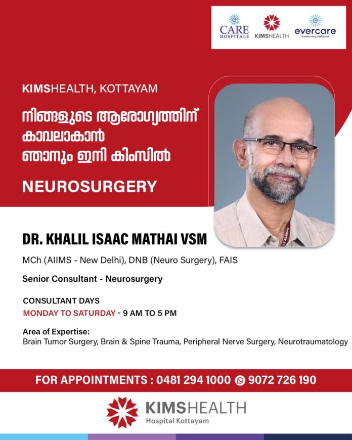 കോട്ടയം : കിംസ് ഹെൽത്ത് ആശുപത്രിയിലെ ന്യൂറോ സർജറി വിഭാഗത്തിൽ ചാർജെടുത്ത് ഡോക്ടർ ഖലീൽ ഐസക് മത്തായി വി എസ് എം.