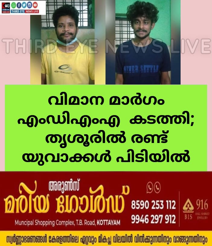 തൃശ്ശൂർ: ലഹരി കടത്തിയ സംഭവത്തിൽ രണ്ട് യുവാക്കൾ തൃശൂരിൽ അറസ്റ്റിൽ. വിമാനത്തിൽ കേരളത്തിലേക്ക് ലഹരി കടത്തിയ സംഭവത്തിലാണ് അറസ്റ്റ്.