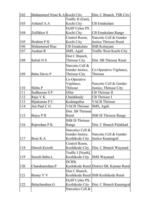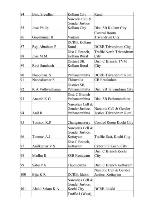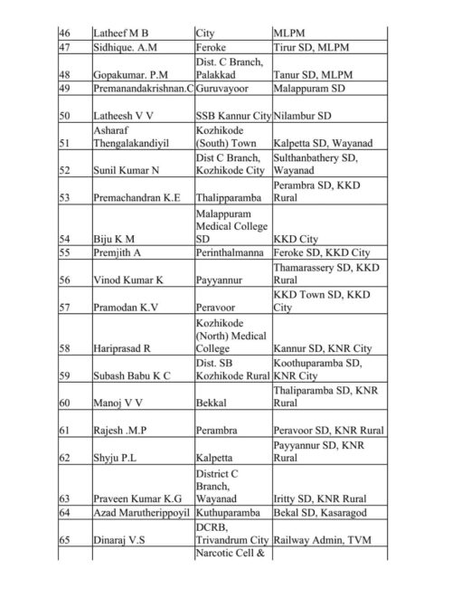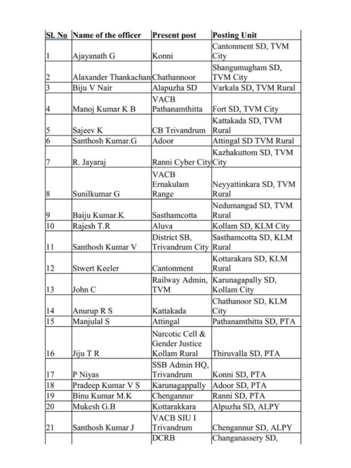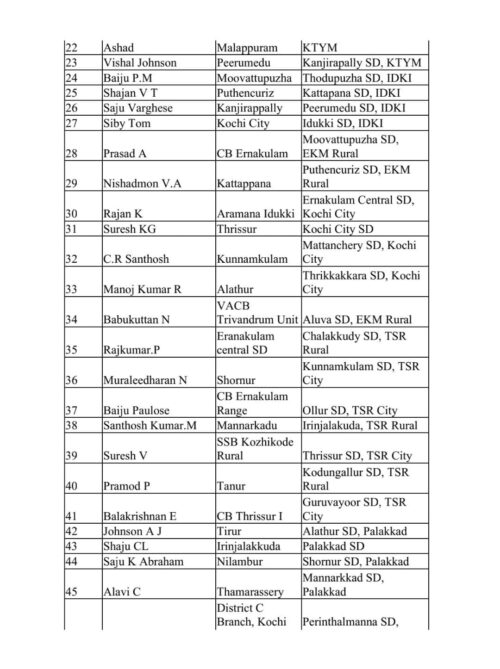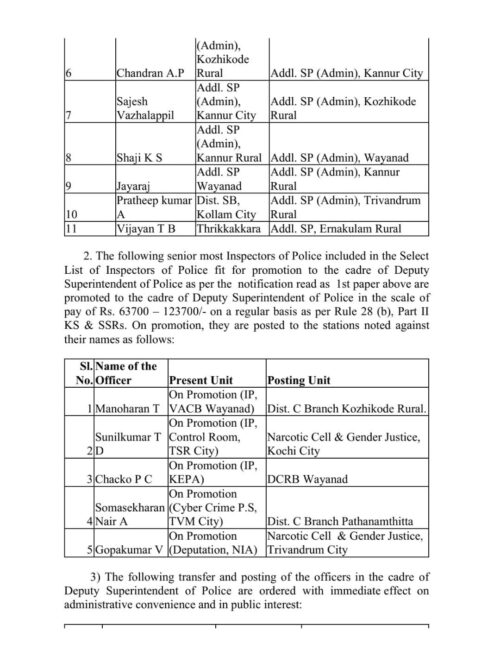 ഡിവൈഎസ്പിമാരായ സാജു വർഗീസ് പീരുമേട്ടിലും, എ ജെ തോമസ് ട്രാഫിക് ഈസ്റ്റ് കൊച്ചിയിലും, തോംസൺ കെ പി കൺട്രോൾ റൂം കൊച്ചിയിലും, വി എ നിഷാദ് മോൻ പുത്തൻകുരിശിലും, വിശാൽ ജോൺസൺ കാഞ്ഞിരപ്പള്ളിയിലും, ടി ആർ ജിജു തിരുവല്ലയിലും, രാജൻ കെ അരമന എറണാകുളം സെൻട്രലിലും, റ്റി ഡി സുനിൽകുമാർ നർക്കോട്ടിക് സെൽ കൊച്ചി സിറ്റിയിലും, ബാബുക്കുട്ടൻ ആലുവയിലും, അനീഷ് കെ ജി ജില്ലാ സ്പെഷ്യൽ ബ്രാഞ്ച് പത്തനംതിട്ടയിലും ഡിവൈഎസ്പി മാരായി ചുമതലയേൽകും.