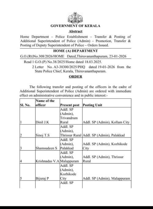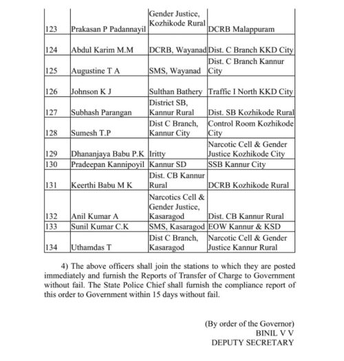 ഏപ്രിൽ, മെയ് മാസത്തോടുകൂടി നിയമസഭാ തിരഞ്ഞെടുപ്പ് വരുന്നതിൻ്റെ മുന്നോടിയായാണ് സംസ്ഥാനത്ത് 11 അഡിഷ്ണൽ എസ്പിമാരെയും 134 ഡിവൈഎസ്പിമാരെയും സ്ഥലംമാറ്റിയത്. ഇതിൻ്റെ തുടർച്ചയായി ഇൻസ്പെക്ടർമാരെയും സബ് ഇൻസ്പെക്ടർമാരെയും വരും ദിവസങ്ങളിൽ സ്ഥലം മാറ്റും. ഇന്ന് സ്ഥലം മാറ്റിയ അഡിഷ്ണൽ എസ്പിമാരുടെയും ഡിവൈഎസ്പിമാരായും വിശദമായ ലിസ്റ്റ് താഴെ വായിക്കാം