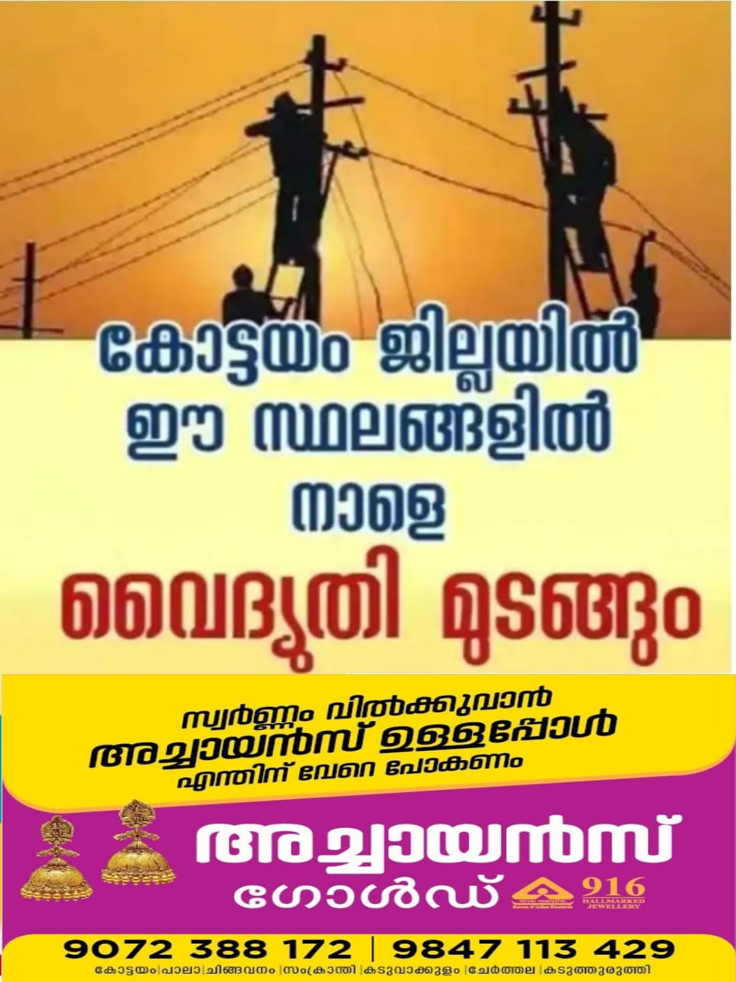 1) തീക്കോയി ഇലക്ട്രിക്കൽ സെക്ഷൻ പരിധിയിൽ വരുന്ന ചേരിപ്പാട്, കല്ലേകുളം എന്നീ ട്രാൻസ്ഫോർമർ പരിധിയിൽ വരുന്ന പ്രദേശങ്ങളിൽ നാളെ (05/07/2023)8.30am മുതൽ5pm വരെ വൈദ്യുതി മുടങ്ങും.
