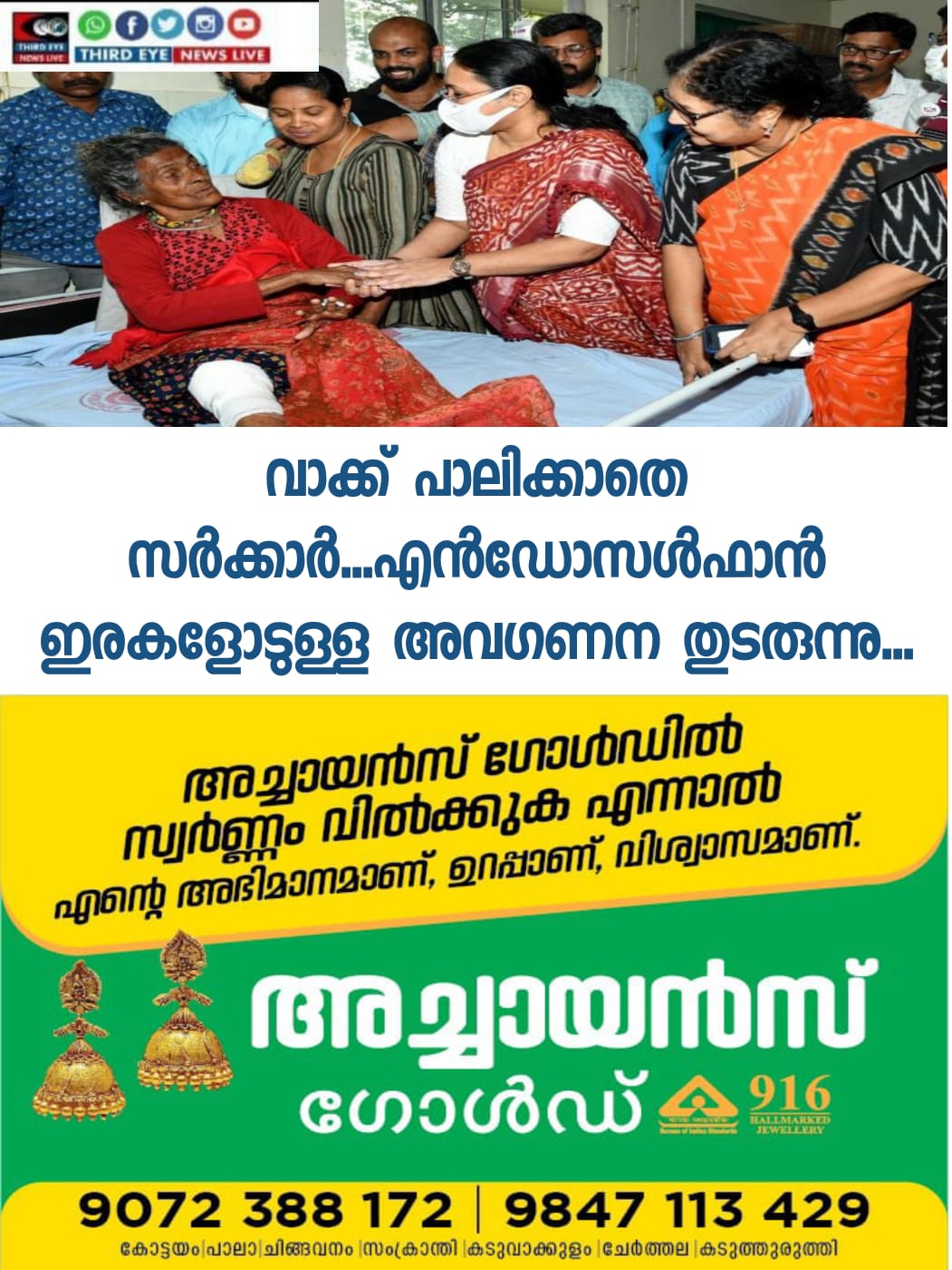 ജില്ലയിലെ ആരോഗ്യമേഖലയിലെ പ്രശ്നങ്ങള്ക്കും എന്ഡോസള്ഫാന് രോഗികളുടെ പ്രശ്നങ്ങള്ക്കും പരിഹാരം തേടി ആഴ്ചകളോളം നിരാഹര സമരം നടത്തിയ സാമൂഹിക പ്രവര്ത്തക ദയാ ബായിയ്ക്ക് മന്ത്രിമാര് നല്കിയ ഉറപ്പുകള് പാഴ്വാഗ്ദാനങ്ങള് മാത്രം. മന്ത്രിമാര് രേഖാമൂലം നല്കിയ ഉറപ്പിനെ തുടര്ന്ന് 18 ദിവസം നടത്തിയ നിരാഹാര സമരം കഴിഞ്ഞ 19 -ാം തിയതിയാണ് ദയാബായി അവസാനിപ്പിച്ചത്. എന്നാല് 10 ദിവസം കഴിയുമ്പോള് കാസര്കോട് ജില്ലയിലെ 34 നഴ്സിങ്ങ് ഓഫീസര്മാരെയാണ് (ഗ്രേഡ് 1) സര്ക്കാര് ഒറ്റയടിക്ക് സ്ഥലം മാറ്റിയത്. 34 നഴ്സിങ്ങ് ഓഫീസര്മാരെ മാറ്റിയതിന് പകരമായി ഒരൊറ്റയാളെ പോലും കാസര്കോട്ടേക്ക് പകരം നിയമിച്ചിട്ടില്ല. ഇതോടെ ജില്ലയിലെ ആരോഗ്യമേഖലയിലെ പ്രതിസന്ധി അതിരൂക്ഷമായി.