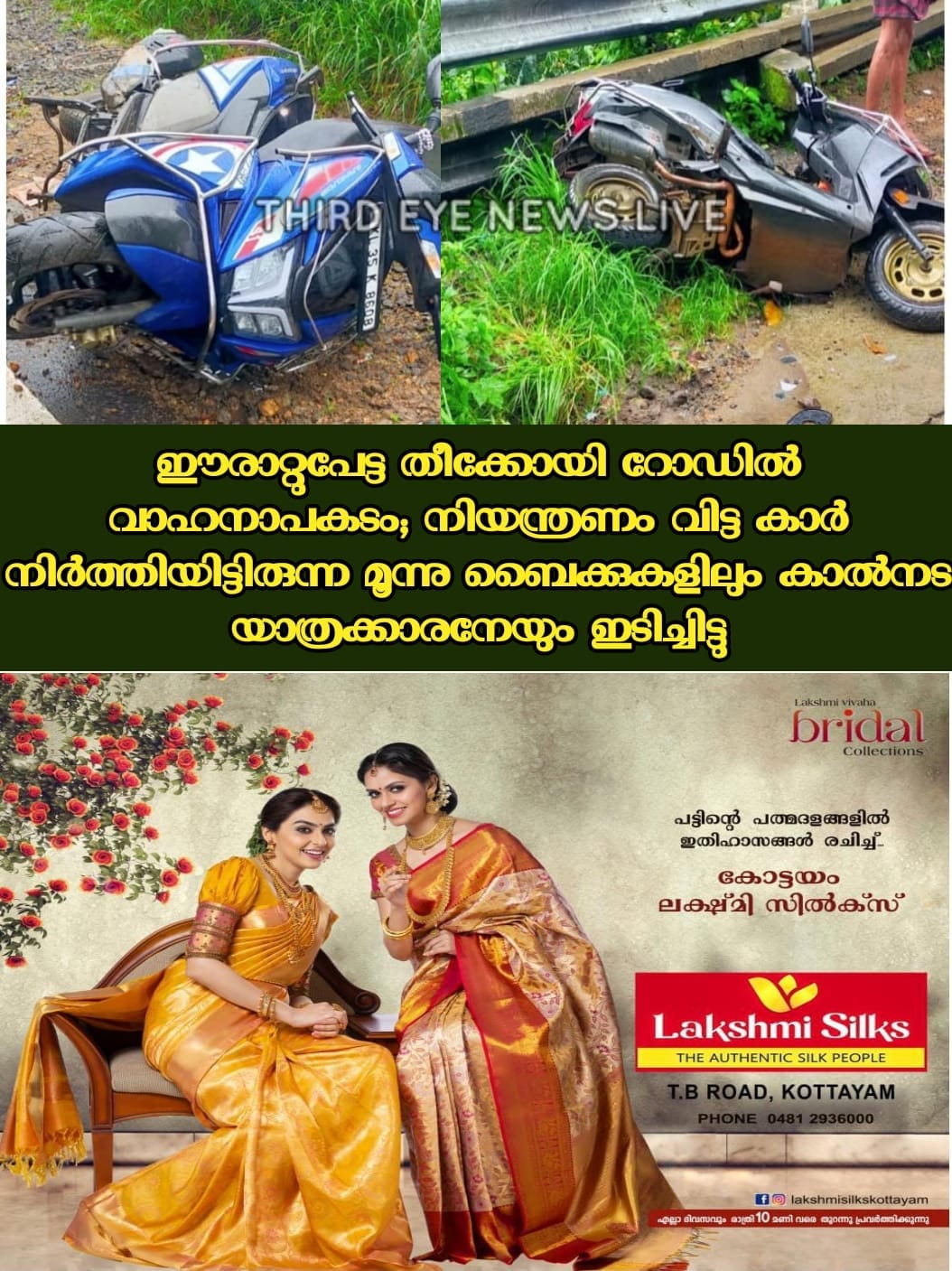 ഇന്ന് രാവിലെയാണ് വാഗമണ്ണിൽ നിന്നും ഈരാറ്റുപേട്ടയ്ക്ക് വന്ന സാൻട്രോ കാർ ടൗണിൽ പാർക്ക് ചെയ്ത മൂന്നു ബൈക്കുകളിലും കാൽനടയാത്രക്കാരനേയും ഇടിച്ചിട്ടു .