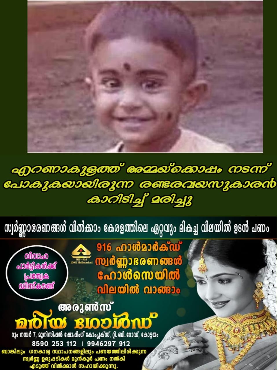 കൊച്ചി: എറണാകുളത്ത് അമ്മയ്ക്കൊപ്പം നടന്ന് പോകുകയായിരുന്ന രണ്ടരവയസുകാരൻ കാറിടിച്ച് മരിച്ചു . പുതിയകാവ് ഊപ്പിടിത്തറ വീട്ടിൽ രഞ്ജിത്തിന്റെയും രമ്യയുടെയും മകൻ ആദിയാണ് മരിച്ചത്.