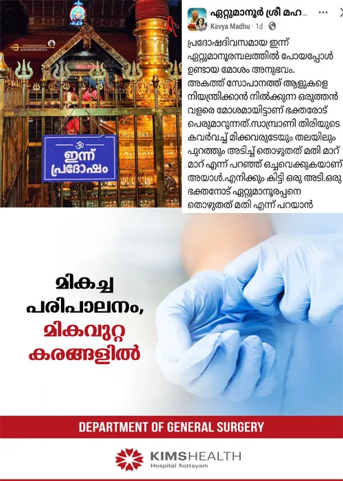 പ്രദോഷദിവസം ഏറ്റുമാനൂരമ്ബലത്തില് പോയപ്പോള് ഉണ്ടായ മോശം അനുഭവം എന്ന പേരില് ഒരു ഭക്ത കുറിച്ച് സോഷ്യല് മീഡിയയില് പങ്ക് വച്ചതോടെയാണ് സംഭവം പുറത്തറിഞ്ഞത്.
