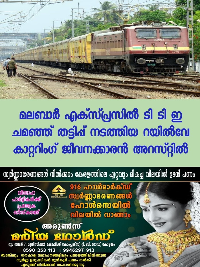 കൊയിലാണ്ടി മൂടാടി സ്വദേശി ഫൈസലിനെയാണ് എറണാകുളം റെയില്വേ പൊലീസ് അറസ്റ്റ് ചെയ്തത്. ഇയാള്ക്കെതിരെ ആള്മാറാട്ടം, വഞ്ചന തുടങ്ങിയ വിവിധ വകുപ്പുകള് പ്രകാരം കേസ് എടുത്തതായി റെയില്വേ പൊലീസ് അറിയിച്ചു. പ്രതി റെയില്വേ കാറ്ററിങ് സര്വീസിലെ ജീവനക്കാരനാണെന്നും റെയില്വേ പൊലീസ് പറഞ്ഞു.