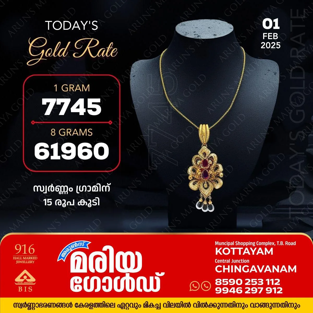 കോട്ടയം : സംസ്ഥാനത്ത് സ്വര്ണവില വീണ്ടും കുതിച്ചുയർന്നു. അറിയാം കോട്ടയം അരുൺസ് മരിയാ ഗോൾഡിലെ സ്വർണവില. ഒരു പവന് 61,960 രൂപയാണ് വിപണി വില.