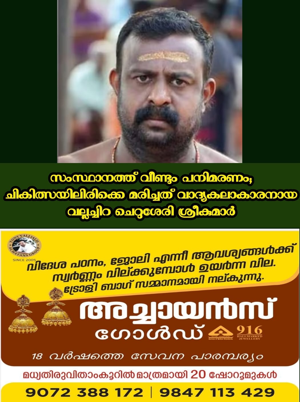 ഏത് തരം പനിയാണ് ബാധിച്ചത് എന്ന് വ്യക്തമല്ല. തൃശൂര് പൂരം, പെരുവനം പൂരം, തൃപ്രയാര് പൂരം തുടങ്ങി പ്രധാന ഉത്സവങ്ങളില് സജീവ സാന്നിധ്യമായിരുന്നു ശ്രീകുമാര്.