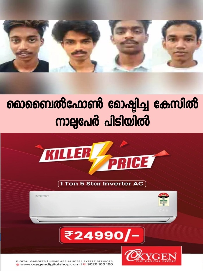 കളമശ്ശേരി: എകെജി റോഡിൽ വീട്ടിൽ നിന്നും മൊബൈൽ ഫോൺ മോഷ്ടിച്ച കേസിൽ നാലുപേരെ കളമശ്ശേരി പോലീസ് പിടികൂടി. തൃക്കാക്കര കരിമക്കാട് തോപ്പിൽ പറമ്പിൽ സുർജിത്(18), പത്തടിപപ്പാലം ചങ്ങമ്പുഴ നഗർ കുടിയിരിക്കൽ നഗർ പ്രവീൺ (19), വട്ടെക്കുന്നം മസ്ജിദ് റോഡ് പള്ളിപ്പറമ്പിൽ സഫർ(20), ഇടപ്പള്ളി ബി എം നഗർ ഇരുകാട്ടുപറമ്പിൽ ലബീബ് (20) എന്നിവരാണ് പിടിയിലായത്.