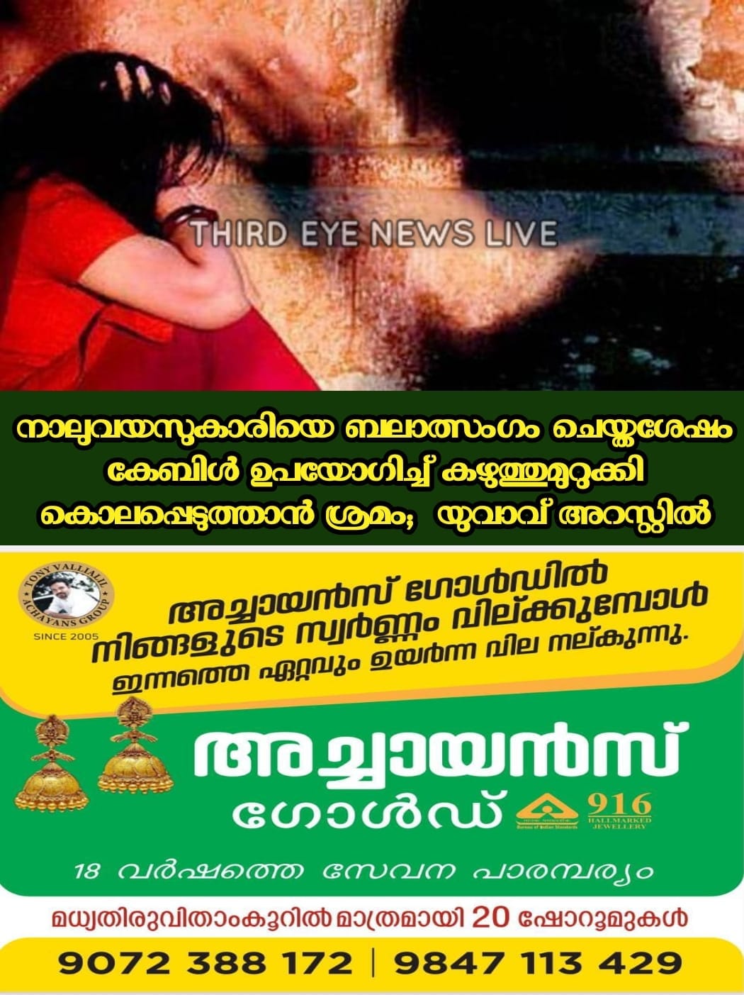 നാലുവയസുകാരിയെ ബലാത്സംഗം ചെയ്തശേഷം കേബിള്‍ ഉപയോഗിച്ച് കഴുത്തുമുറുക്കി കൊലപ്പെടുത്താൻ ശ്രമം; യുവാവ് അറസ്റ്റിൽ