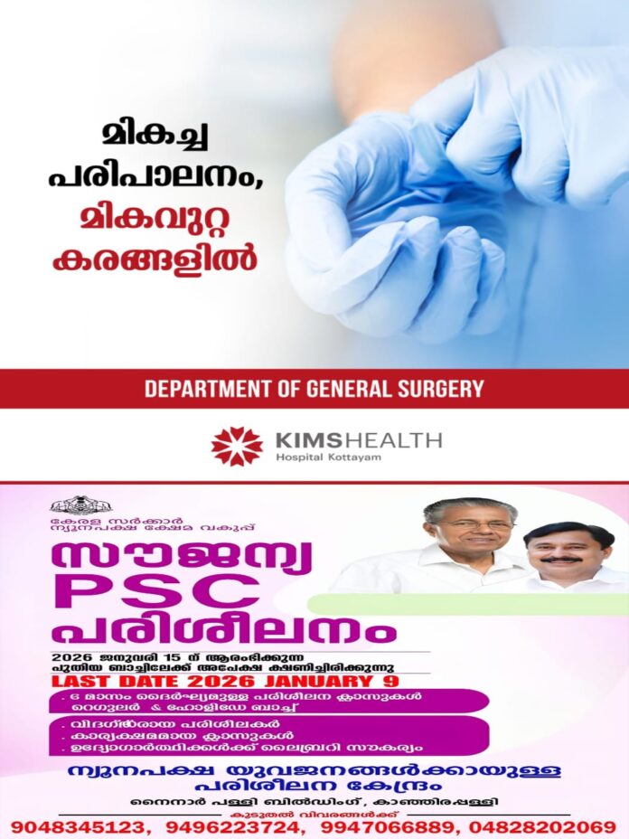 കാഞ്ഞിരപ്പള്ളി: കേരള സംസ്ഥാന ന്യൂനപക്ഷ ക്ഷേമ വകുപ്പിന് കീഴില് കോട്ടയം ജില്ലയിലെ കാഞ്ഞിരപ്പള്ളിയില് പ്രവര്ത്തിക്കുന്ന ന്യൂനപക്ഷ യുവജനങ്ങള്ക്കായുള്ള പരിശീലന കേന്ദ്രത്തില് 2026 ജനുവരി 15 ന് ആരംഭിക്കുന്ന സൗജന്യ പി എസ് സി കോച്ചിങ്ങിനു അപേക്ഷ ക്ഷണിച്ചു.
