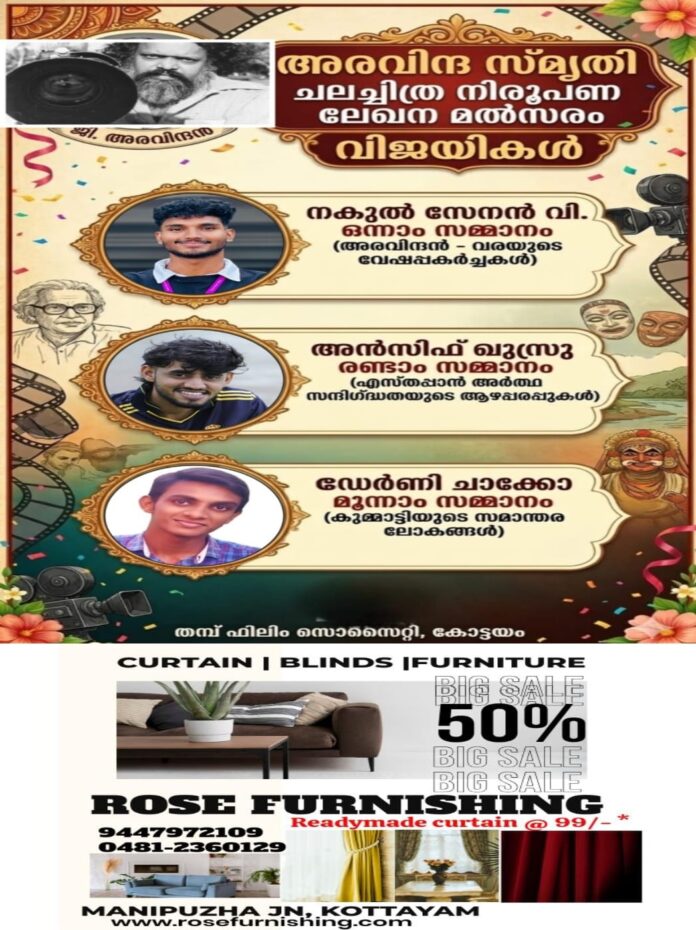 തമ്പ് ഫിലിം സൊസൈറ്റിയുടെ ആഭിമുഖ്യത്തിൽ സംഘടിപ്പിച്ച ജി. അരവിന്ദൻ അനുസ്മരണ ചലച്ചിത്രനിരൂപണ ലേഖനമത്സരത്തിൽ വിജയികളെ പ്രഖ്യാപിച്ചു. എറണാകുളം തേവര സേക്രഡ് ഹാർട്ട് കോളജിലെ മൂന്നാം വർഷ ബി. എ. അനിമേഷൻ ആൻഡ് വിഷ്വൽ എഫക്ടസ് വിദ്യാർഥിയായ നകുൽ സേനൻ വി. എഴുതിയ ‘ അരവിന്ദൻ – വരയുടെ വേഷപ്പകർച്ചകൾ’ എന്ന ലേഖനത്തിനാണ് ഒന്നാം സമ്മാനം.