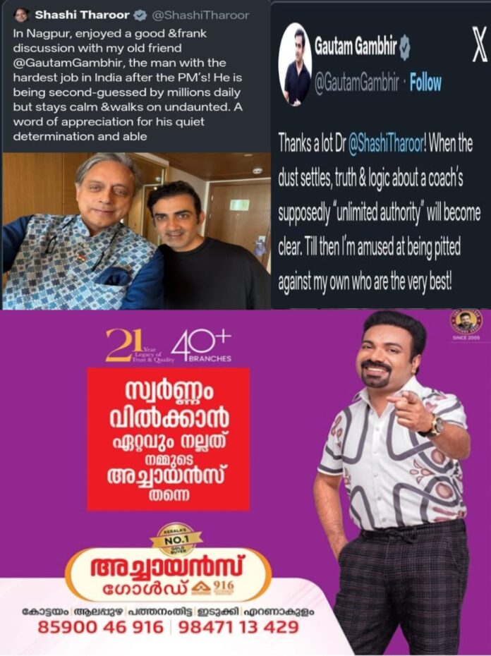 ഒരുപാട് നന്ദി ഡോ.ശശി തരൂര്, എല്ലാ പൊടിപടലങ്ങളും അടങ്ങിക്കഴിയുമ്പോള് കോച്ചിന് സര്വാധികാരങ്ങളുണ്ടെന്ന തോന്നലിന് പിന്നിലെ സത്യവും വസ്തുതയും പുറത്തുവരും. അതുവരെ, ഏറ്റവും മികച്ചവരുമായി എന്നെ താരതമ്യം ചെയ്യുന്നത് കാണുമ്പോള് കൗതുകം തോന്നുന്നുവെന്നായിരുന്നു ഗംഭീറിന്റെ മറുപടി.