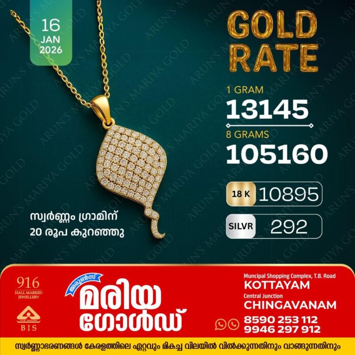 കോട്ടയം: സ്വർണ്ണവിലയിൽ വീണ്ടും കുതിപ്പ്. സംസ്ഥാനത്ത് ഇന്ന് (16/01/26) സ്വർണ്ണവില ഗ്രാമിന് 20 രൂപ കുറഞ്ഞു. കോട്ടയം അരുൺസ് മരിയ ഗോൾഡിലെ ഇന്നത്തെ സ്വർണ്ണവില അറിയാം.
