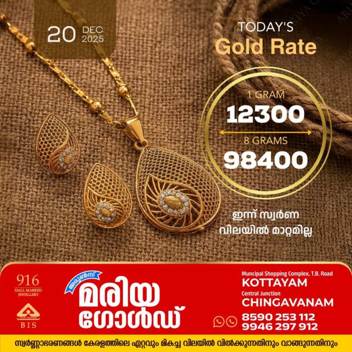 കോട്ടയം: സംസ്ഥാനത്ത് ഇന്ന് സ്വർണ്ണവിലയിൽ മാറ്റമില്ല. കോട്ടയം അരുൺസ് മരിയ ഗോൾഡിലെ ഇന്നത്തെ (20/12/25) സ്വർണ്ണവില അറിയാം.