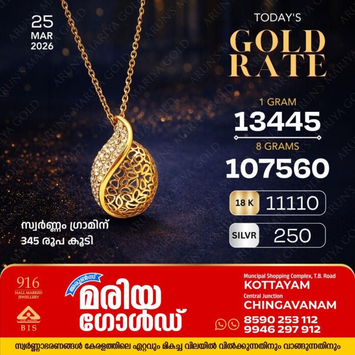 സ്ഥാനത്ത്‌ സ്വർണ്ണവിലയിൽ വർധനവ്; ഇന്ന്  (25/04/26) സ്വർണ്ണം ഗ്രാമിന് 345 രൂപ കൂടി; അറിയാം കോട്ടയം അരുൺസ് മരിയാ ഗോൾഡിലെ സ്വർണ്ണവില