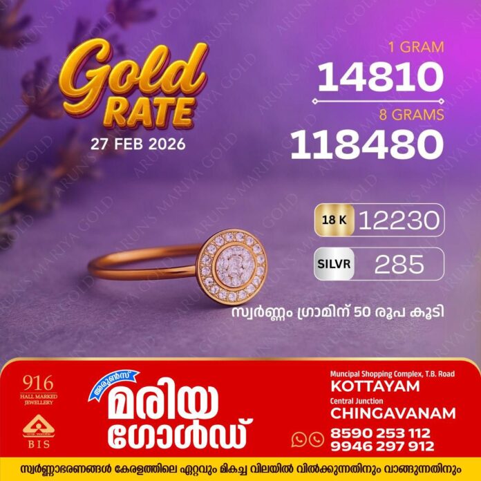 സ്വർണ്ണവിലയിൽ നേരിയ വർദ്ധനവ്; സംസ്ഥാനത്ത്‌ ഇന്ന് (27/02/26) സ്വർണ്ണവില ഗ്രാമിന് 50 രൂപ കൂടി; അറിയാം കോട്ടയം അരുൺസ് മരിയാ ഗോൾഡിലെ  സ്വർണ്ണവില
