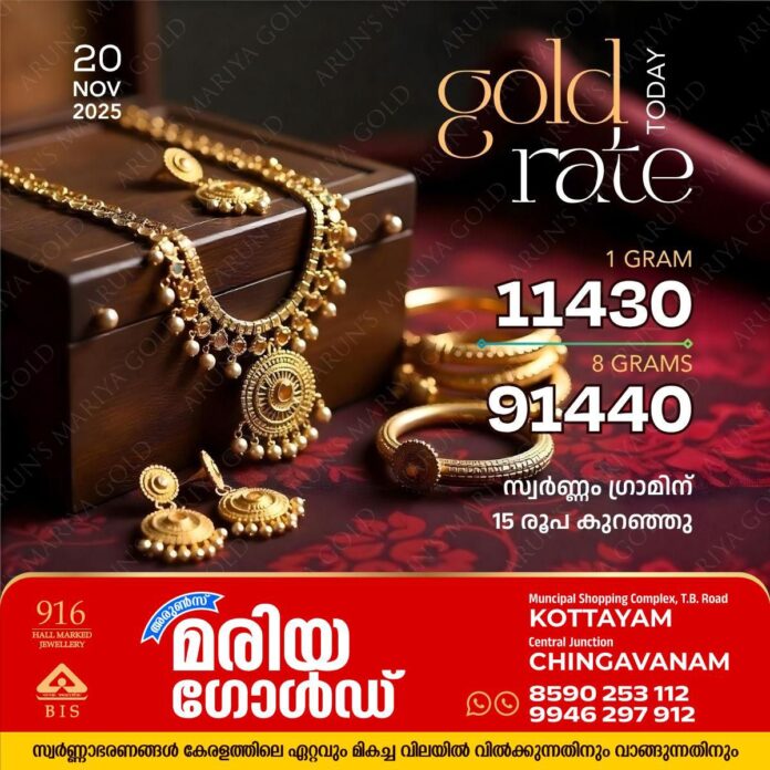 കോട്ടയം: സംസ്ഥാനത്ത് ഇന്ന് സ്വർണ്ണവില 15 രൂപ കുറഞ്ഞു. കോട്ടയം അരുൺസ് മരിയ ഗോൾഡിലെ ഇന്നത്തെ സ്വർണ്ണവില അറിയാം.