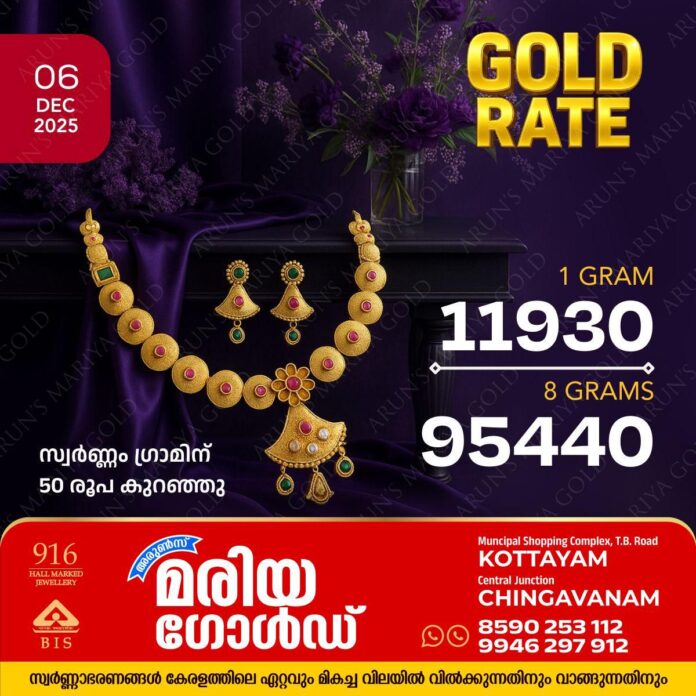 കോട്ടയം: സംസ്ഥാനത്ത് ഇന്ന് സ്വർണ്ണവില 50 രൂപ കുറഞ്ഞു. കോട്ടയം അരുൺസ് മരിയ ഗോൾഡിലെ ഇന്നത്തെ സ്വർണ്ണവില അറിയാം.