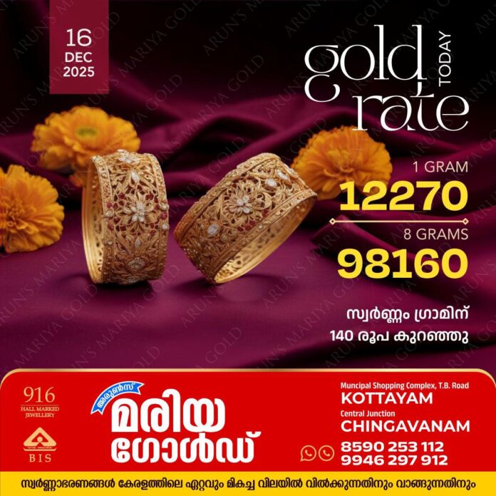 കോട്ടയം: സ്വർണ്ണവിലയിൽ കുറവ്. സംസ്ഥാനത്ത് ഇന്ന് (16/12/25) സ്വർണ്ണവില ഗ്രാമിന് 140 രൂപ കുറഞ്ഞു. കോട്ടയം അരുൺസ് മരിയ ഗോൾഡിലെ ഇന്നത്തെ സ്വർണ്ണവില അറിയാം.