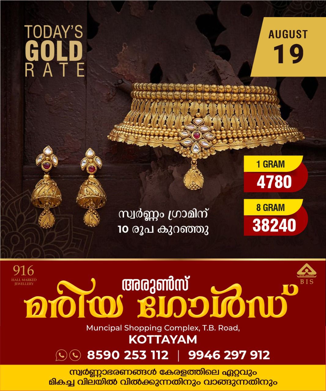 കൊച്ചി :സംസ്ഥാനത്ത് സ്വർണവിലയിൽ ഇടിവ് .പവന് 80 രൂപ കുറഞ്ഞ് 38240 രൂപയിലെത്തി .ഗ്രാമിന് 10 രൂപ കുറഞ്ഞ് 4780 രൂപയിലെത്തി .