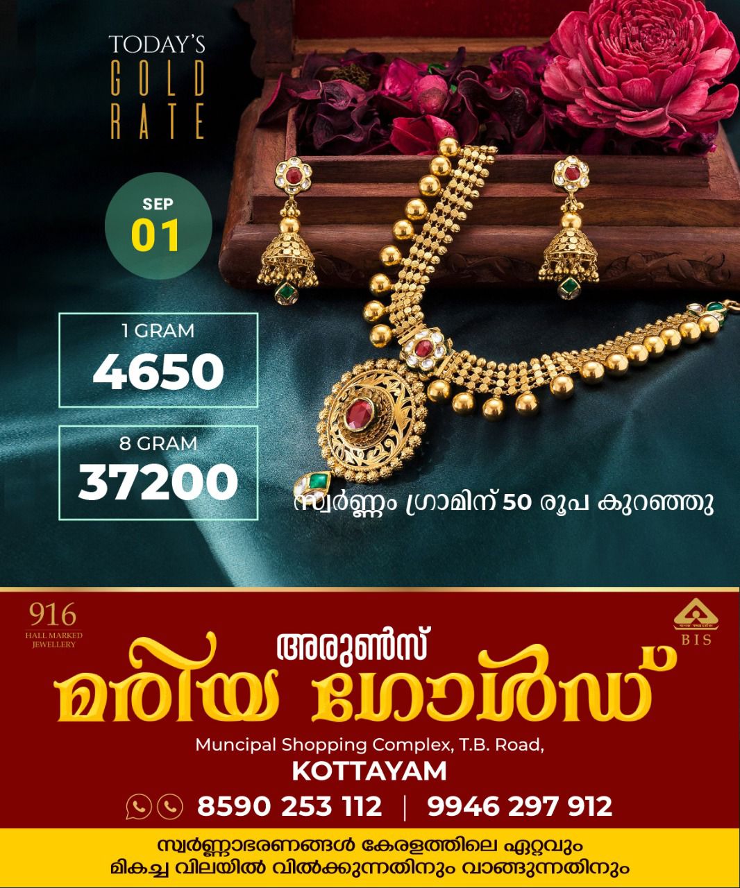 സംസ്ഥാനത്ത് ഇന്നത്തെ ( 01/09/2022) സ്വർണവില കുറഞ്ഞു; 400 രൂപ കുറഞ്ഞ് പവന് 37,200 രൂപയായി September 1, 2022 WhatsAppFacebookTwitterLinkedin Spread the loveകൊച്ചി: സംസ്ഥാനത്ത് സ്വര്ണവില കുറഞ്ഞു. 400 രൂപ കുറഞ്ഞ് ഒരു പവന് സ്വര്ണത്തിന്റെ വില 37,200 രൂപയായി. ഗ്രാമിന് 50 രൂപ കുറഞ്ഞ് 4650 രൂപയായി. കോട്ടയത്തെ ഇന്നത്തെ സ്വർണവില അരുൺസ് മരിയ ഗോൾഡ് പവന്- 37200 ഗ്രാമിന്- 4650