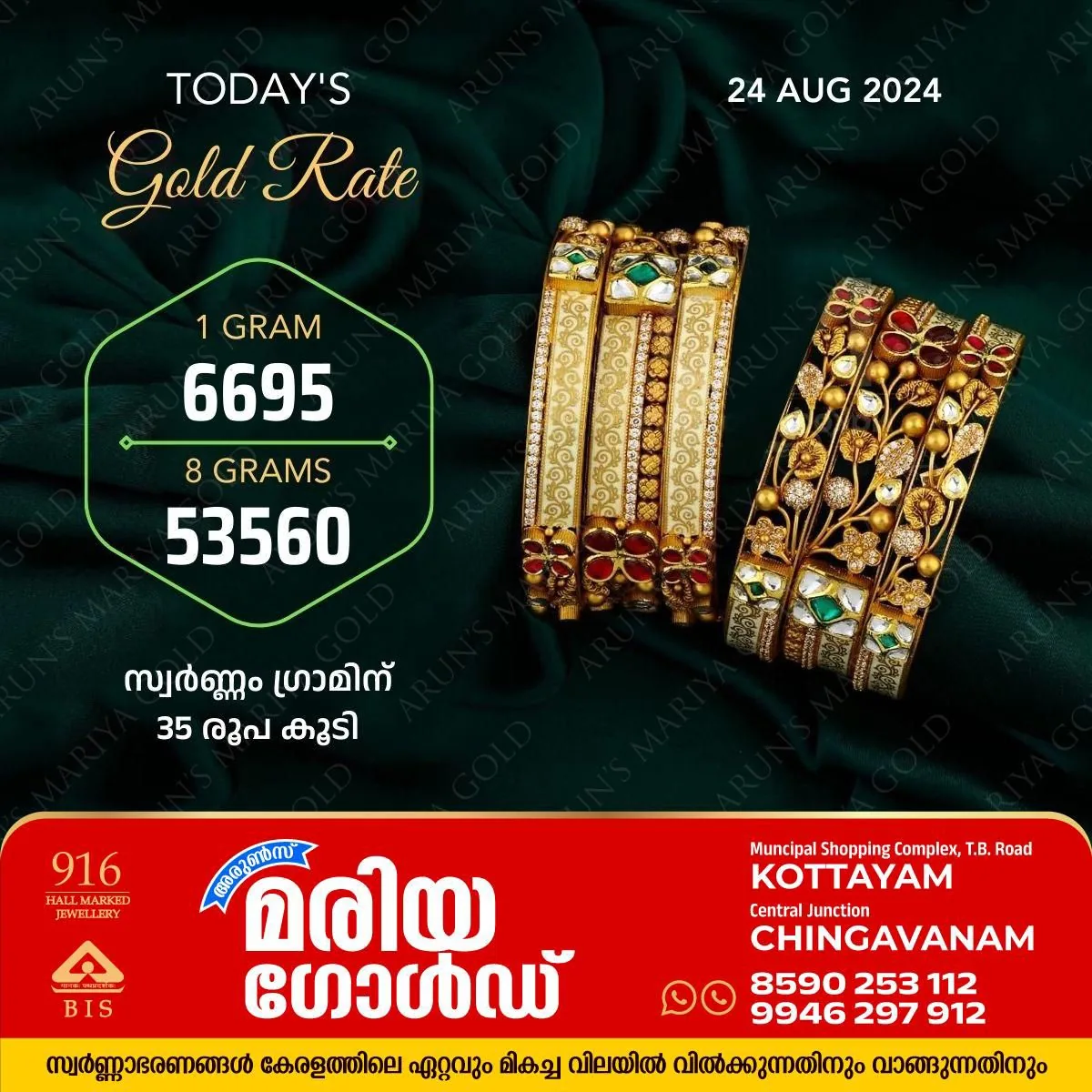 സംസ്ഥാനത്ത് ഇന്ന് (24/08/2024) സ്വർണവില കൂടി ; സ്വർണം ഗ്രാമിന് 35 രൂപ കൂടി,കോട്ടയം അരുൺസ് മരിയ ഗോൾഡിന്റെ ഇന്നത്തെ സ്വർണവില അറിയാം