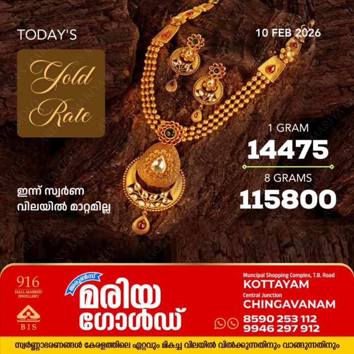 കോട്ടയം : സംസ്ഥാനത്ത് മാറ്റമില്ലാതെ സ്വർണവില. അറിയാം കോട്ടയം അരുൺസ് മരിയാ ഗോൾഡിലെ ഇന്നത്തെ സ്വർണ വില