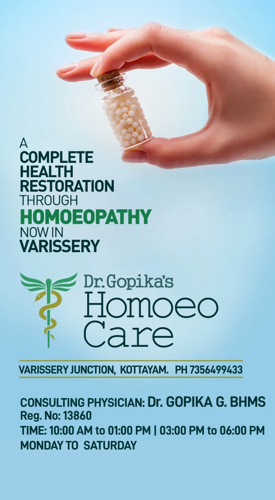 ഇന്ന് പലരും ആരോഗ്യ സംരക്ഷണത്തിനായി ഹോമിയോ മരുന്നുകളെ മാത്രം ആശ്രയിക്കുന്നു. അത്തരത്തിൽ ഏറ്റവും മികച്ച ചികിൽസ നല്കുന്ന ഹോമിയോ ക്ലിനിക്കാണ് വാരിശേരി ജംഗ്ഷനിൽ പ്രവർത്തനമാരംഭിച്ച ഡോക്ടർ ഗോപികാസ് ഹോമിയോ ക്ലിനിക്ക്.