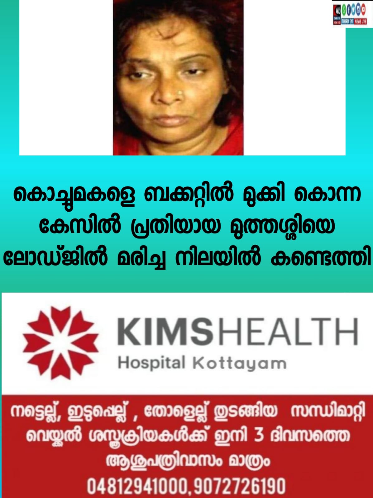 കൊച്ചി: പേരക്കുട്ടിയെ ബക്കറ്റിൽ മുക്കിക്കൊന്ന കേസിലെ കൂട്ടുപ്രതിയായ മുത്തശ്ശിയെ ലോഡ്ജിൽ മരിച്ച നിലയിൽ കണ്ടെത്തി. അങ്കമാലി കോടിശേരി വീട്ടിൽ സിപ്സിയെ (42) കൊച്ചി നഗരത്തിലെ ലോഡ്ജിലാണ് മരിച്ച നിലയിൽ കണ്ടെത്തിയത്.