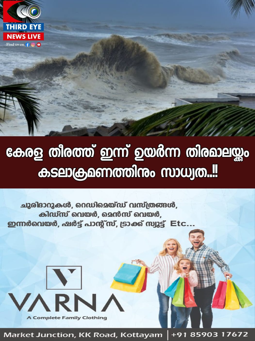 തിരുവനന്തപുരം; കേരള തീരത്ത് ഇന്ന് ഉയർന്ന തിരമാലയ്ക്കും കടലാക്രമണത്തിനും സാധ്യതയുണ്ടെന്ന് ദേശീയ സമുദ്രസ്ഥിതിപഠന ഗവേഷണ കേന്ദ്രം. ഇന്ന് രാത്രി 11.30 വരെ 0.8 മുതൽ 1.2 മീറ്റർ വരെ ഉയർന്ന തിരമാലയ്ക്കും കടലാക്രമണത്തിനുമാണ് സാധ്യത. ആയതിന്റെ വേഗത 20 – 40 cm/sec വരെ മാറിവരുവാൻ സാധ്യതയുള്ളതിനാൽ മത്സ്യത്തൊഴിലാളികളും തീരദേശവാസികളും ജാഗ്രത പാലിക്കണമെന്ന് മുന്നറിയിപ്പു നൽകി.