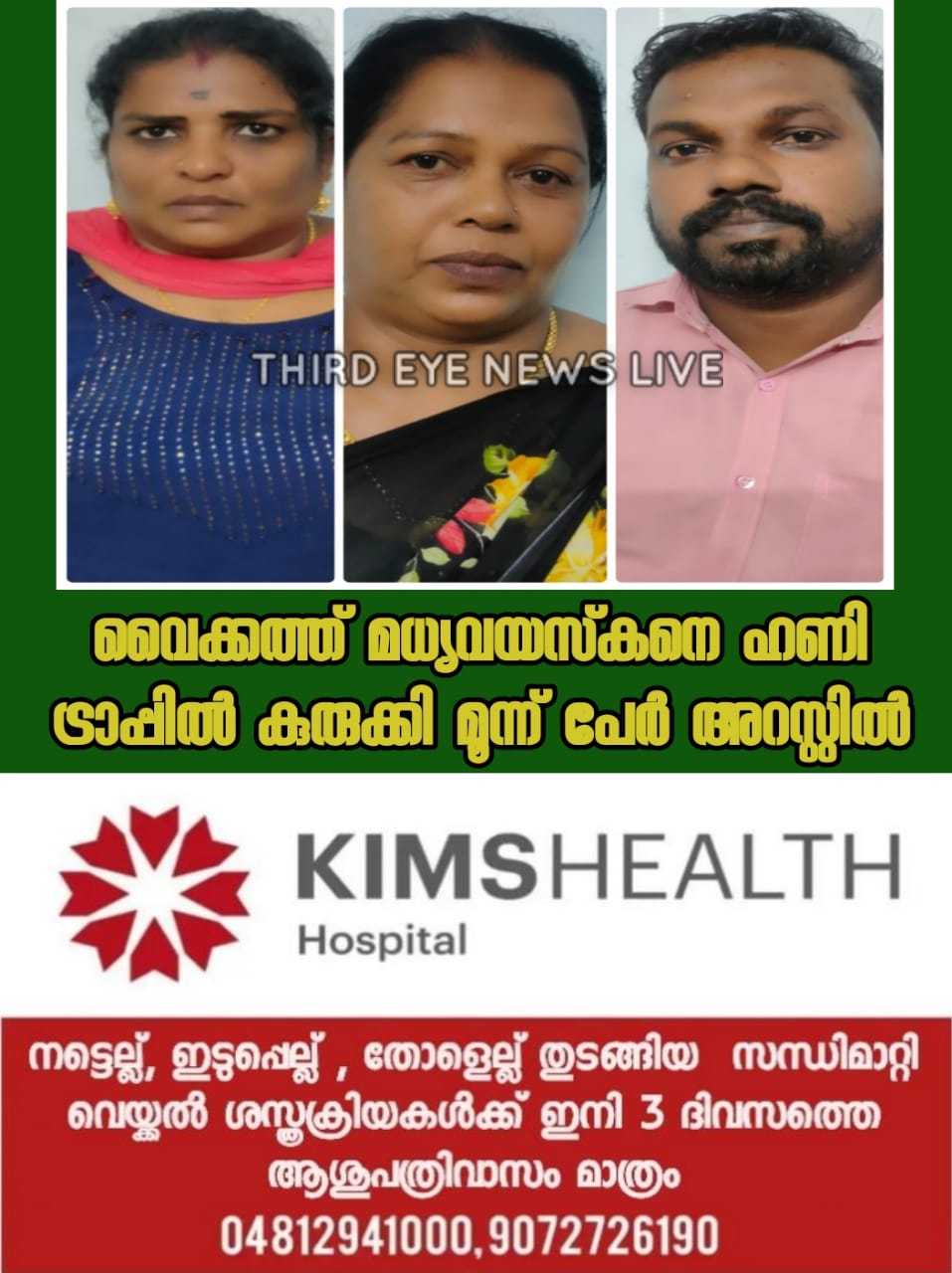 കോട്ടയം: വൈക്കത്ത് റൂഫ് വർക്ക് ജോലിക്കായി വിളിച്ചുവരുത്തി മധ്യവയസ്കനെ ഹണി ട്രാപ്പിൽ കുരുക്കി പണം തട്ടാൻ ശ്രമിച്ച കേസിൽ രണ്ട് യുവതികൾ അടക്കം മൂന്ന് പേർ അറസ്റ്റിൽ. ശാസ്തക്കുളം ഭാഗത്ത് കുന്നപ്പള്ളിൽ വീട്ടിൽ വിജയന്റെ ഭാര്യ ഷീബ (രതിമോൾ) (49), ഓണംതുരുത്ത് പടിപ്പുരയിൽ വീട്ടിൽ മഹേഷിന്റെ ഭാര്യ രഞ്ജിനി (37),കുമരകം ഇല്ലിക്കുളംചിറ വീട്ടിൽ പുഷ്കരൻ മകൻ ധൻസ് (39) എന്നിവരെയാണ് വൈക്കം പൊലീസ് അറസ്റ്റ് ചെയ്തത്.