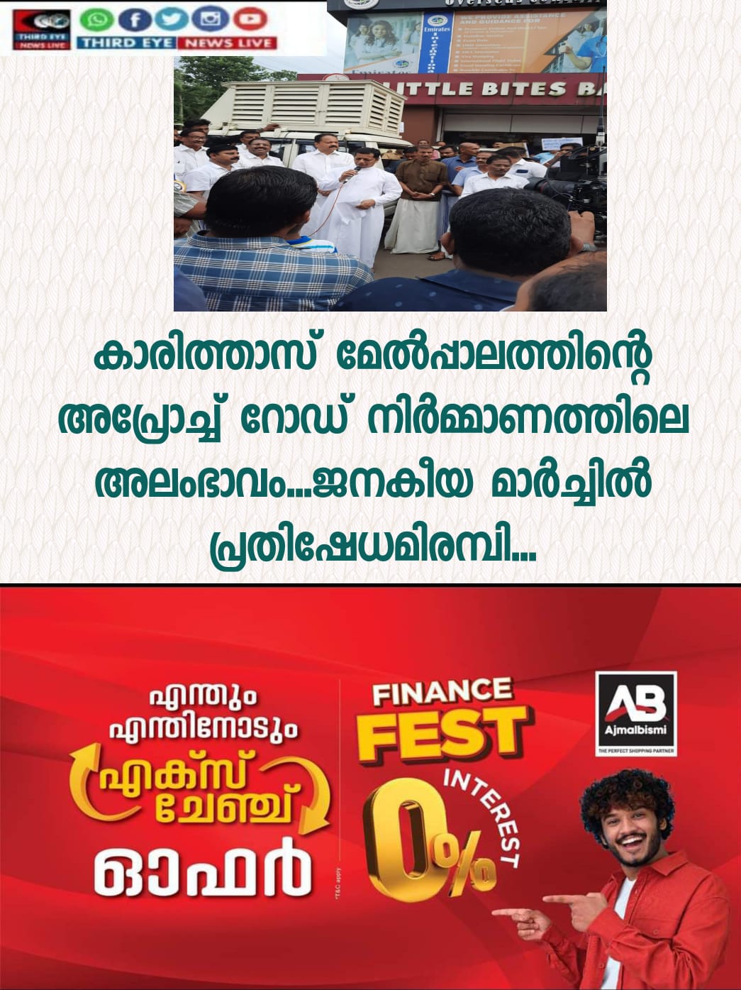 കാരിത്താസ് മേല്പ്പാലത്തിന്റെ അപ്രോച്ച് റോഡ് നിര്മാണത്തിലെ അലംഭാവത്തിനെതിരേ വന് പ്രതിഷേധം. മുണ്ടകപ്പാടം ജനകീയ സമിതിയുടെ നേതൃത്വത്തില് ഇന്നലെ നടന്ന ജനകീയ മാര്ച്ചില് വൻ പ്രതിഷേധമാണ് ഇരമ്പിയത്. കുട്ടികളും സ്ത്രീകളും വൈദികരും കന്യാസ്ത്രികളുമടക്കം നൂറുകണക്കിന് ആളുകള് അണിചേർന്നതോടെ ഒരു നാടിന്റെയാകെ പ്രതിഷേധമായി മാർച്ച് മാറി.