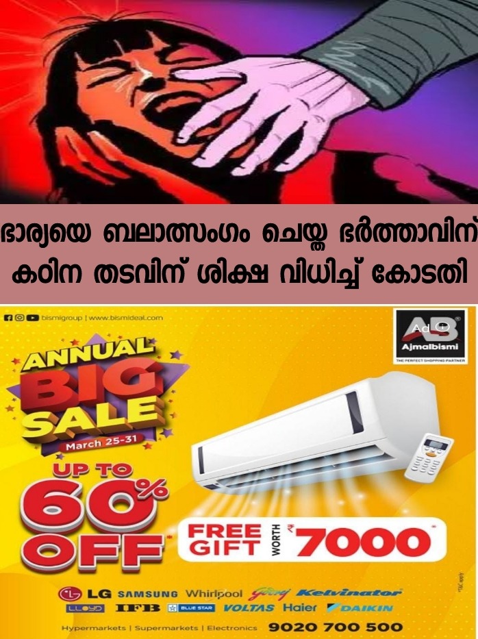 മലപ്പുറം: ഭാര്യയെ അതിക്രൂരമായി ബലാൽസംഗം ചെയ്ത ഭർത്താവിന് മഞ്ചേരി അഡീഷണൽ ജില്ലാ സെഷൻസ് കോടതി (ഒന്ന്) ഒരു വർഷം കഠിന തടവും 25,000 രൂപ പിഴയും ശിക്ഷ വിധിച്ചു. പിഴയടച്ചില്ലെങ്കിൽ മൂന്നു മാസത്തെ അധിക തടവും അനുഭവിക്കണം. അമരമ്പലം താഴെ ചുള്ളിയോട് കുന്നുമ്മൽ മുഹമ്മദ് റിയാസ് (36)നെയാണ് ജഡ്ജി എസ് നസീറ ശിക്ഷിച്ചത്. കേസിലെ രണ്ടാം പ്രതി ഭർതൃപിതാവ് അബ്ദു (63), മൂന്നാം പ്രതി ഭർതൃമാതാവ് നസീറ (42) എന്നിവരെ തെളിവുകളുടെ അഭാവത്തിൽ കോടതി വെറുതെ വിട്ടു.