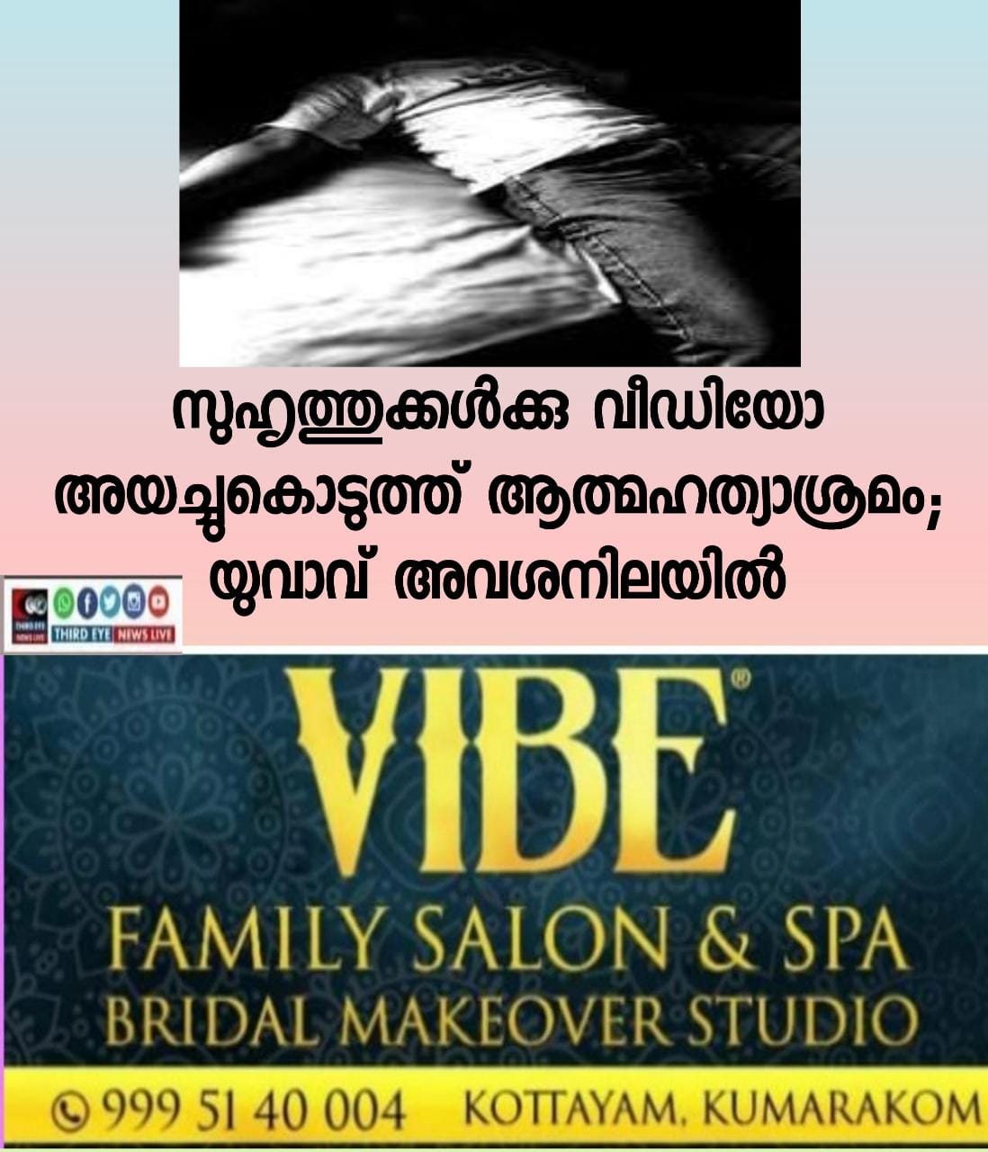 നിരാശനായ യുവാവ് താന് ആത്മഹത്യ ചെയ്യുകയാണന്നു കാണിച്ചു സുഹൃത്തുകള്ക്കു വീഡിയോ അയച്ചു. സുഹൃത്തുക്കള് ഇതു മുരിക്കാശേരി പോലീസിന് അയച്ചുകൊടുത്തു.