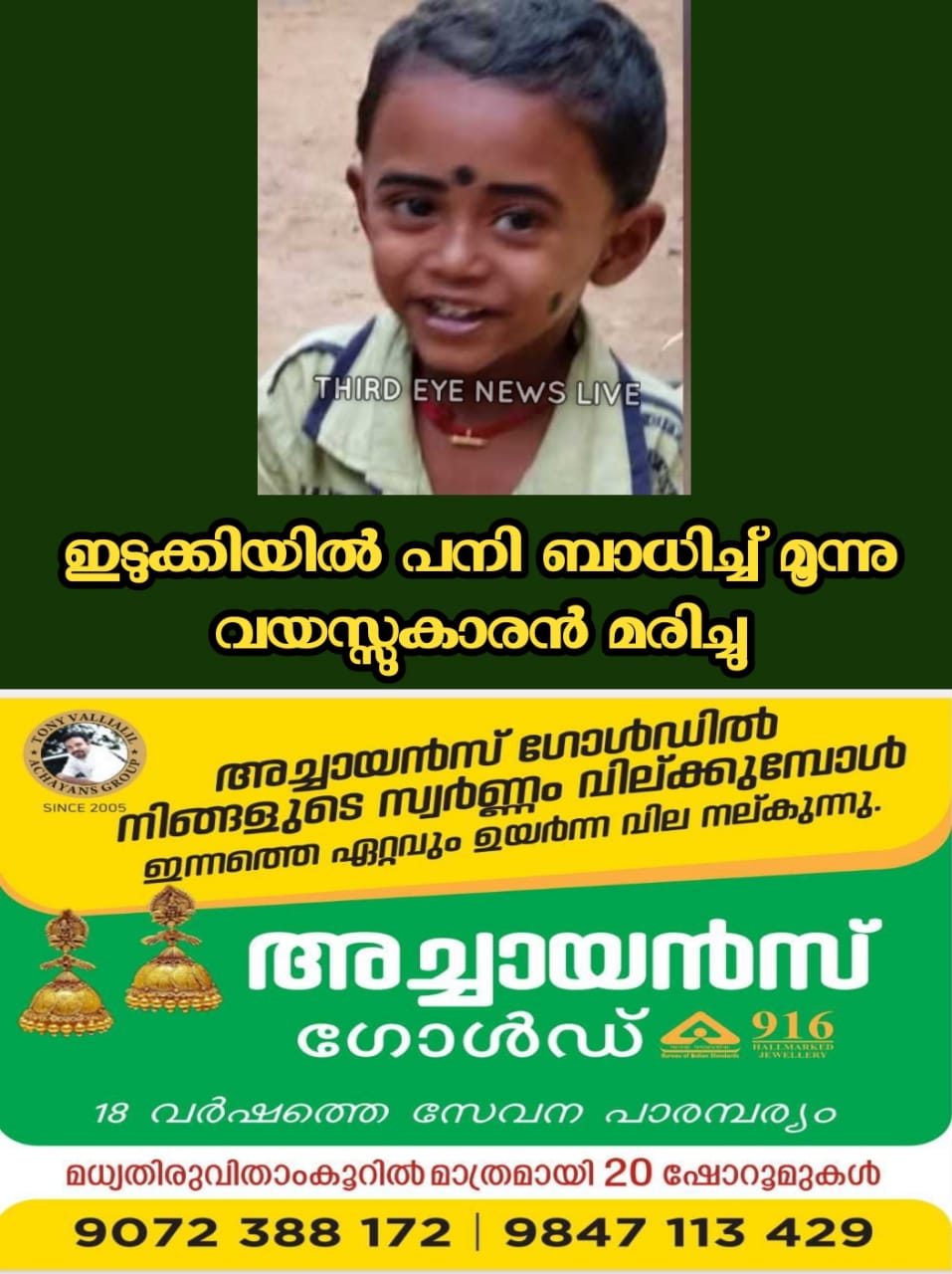 തൊടുപുഴ: സംസ്ഥാനത്ത് വീണ്ടും പനി മരണം. ഇടുക്കിയിൽ പനി ബാധിച്ച് മൂന്നു വയസ്സുകാരൻ മരിച്ചു. തൂക്കുപാലം അണക്കരമെട്ട് മണിയംകോട് രതീഷ് – പ്രീതി ദമ്പതികളുടെ മകൻ ആദിദേവാണ് മരിച്ചത്. കോട്ടയം മെഡിക്കൽ കോളജ് ആശുപത്രിയിൽ ചികിത്സയിലിരിക്കെയാണ് മരണം.