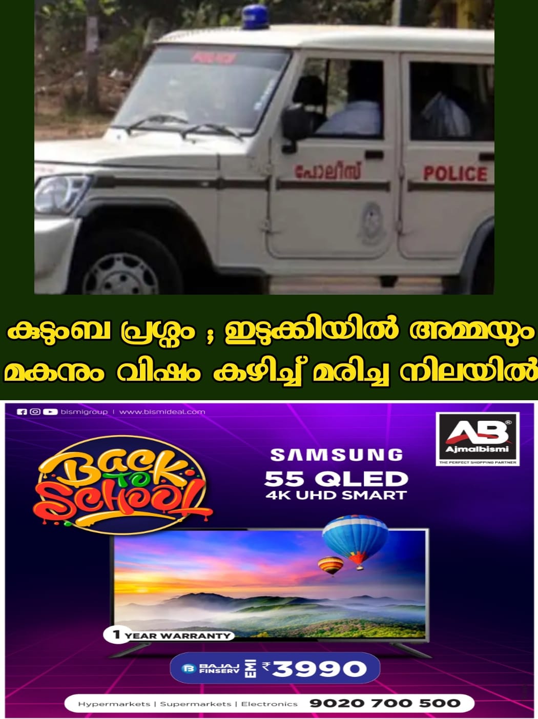 ഇടുക്കി: കുടുംബ പ്രശ്നം മൂലം ഇടുക്കിയിൽ അമ്മയും മകനും വിഷം കഴിച്ച് മരിച്ച നിലയിൽ. ഇടുക്കി കൊന്നത്തടി ഇഞ്ചപതാലിൽ ഇരളാങ്കല് ശശിധരൻ (55), അമ്മ മീനാക്ഷി (80) എന്നിവരാണ് മരിച്ചത്. ആത്മഹത്യയെന്ന് പ്രാഥമിക നിഗമനം. ഇരുവരും വിഷം കഴിച്ച് മരിക്കുകയായിരുന്നു. കുടുംബ പ്രശ്നമാണ് മരണത്തിന് കാരണമെന്നാണ് പ്രാഥമിക വിവരം.