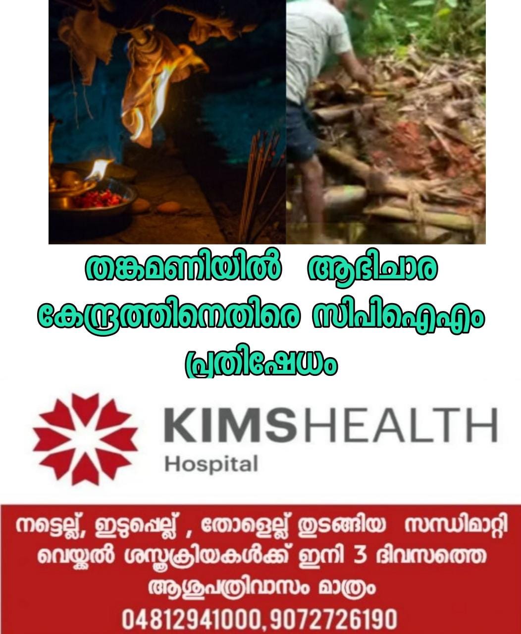 ഇടുക്കി :തങ്കമണി യൂദാഗിരിയിലെ ആഭിചാര കേന്ദ്രത്തിനെതിരെ സിപിഐഎം പ്രതിഷേധം. പൊലീസ് താക്കീത് നല്കിയിട്ടും മൃഗബലി തുടരുന്നു എന്ന് ആരോപിച്ചായിരുന്നു പ്രതിഷേധം. യൂദാഗിരി സ്വദേശി റോബിന്റെ പറമ്പിലുണ്ടായിരുന്ന ബലിത്തറകള് സിപിഐഎം പ്രവര്ത്തകര് പൊളിച്ചു നീക്കി.