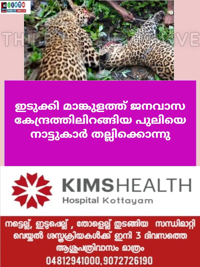 മറ്റ് നാട്ടുകാരേയും പുലി ആക്രമിക്കാന് മുതിര്ന്നതോടെയാണ് നാട്ടുകാര് കൂട്ടം ചേര്ന്ന് പുലിയെ തല്ലിക്കൊന്നത്. വെള്ളിയാഴ്ച രാത്രിയോടെ രണ്ട് ആടുകളേയും പുലി കൊന്നിരുന്നു. കഴിഞ്ഞ കുറച്ചു ദിവസങ്ങളായി മാങ്കുളത്ത് പുലി ഇറങ്ങുന്നതിന്റെ ആശങ്ക നിലനിന്നിരുന്നു.