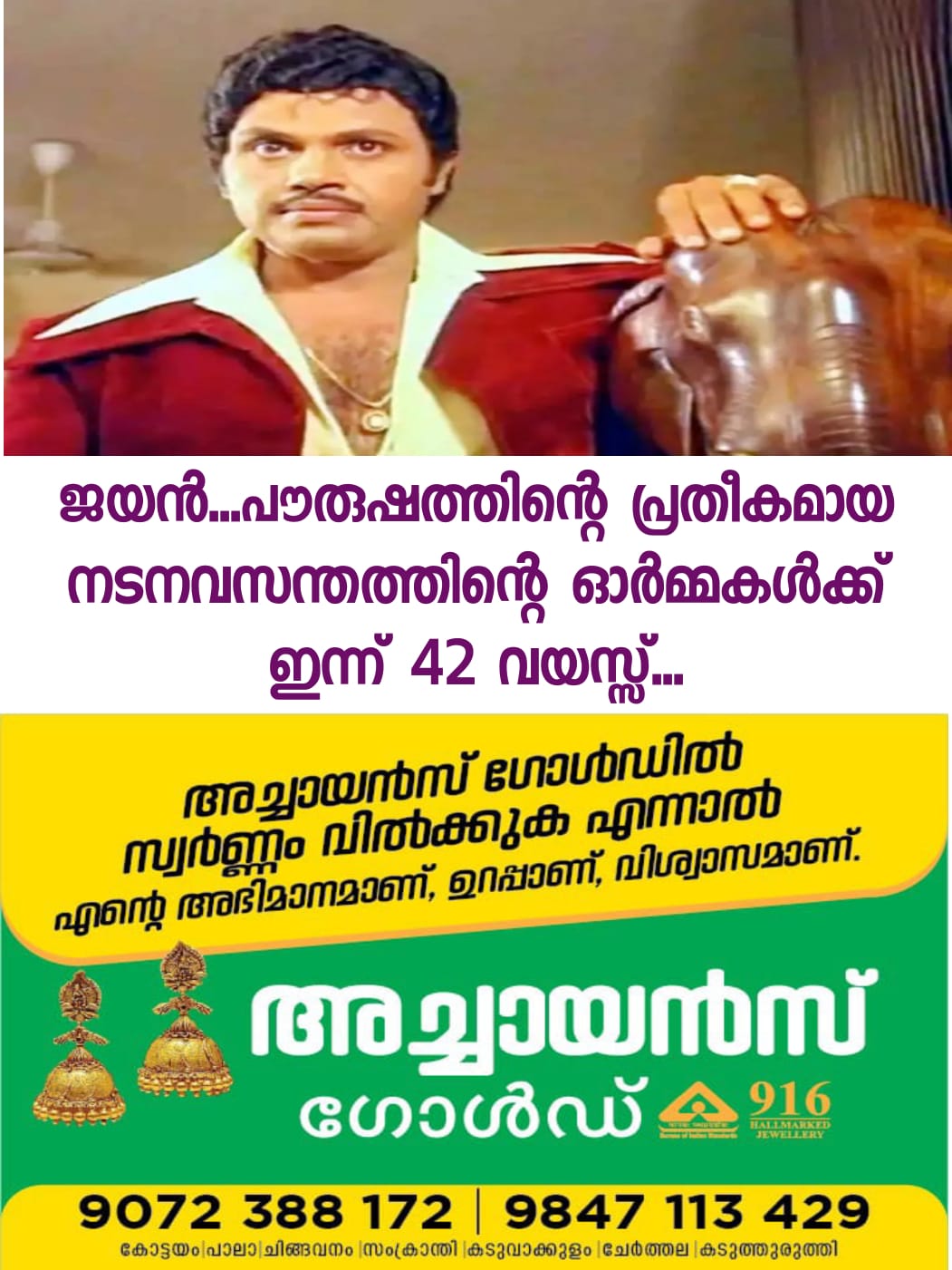1980 നവംബര് 16ന് നാടും നഗരവും ഒരു പ്രിയമുള്ളവന്റെ വിയോഗത്തില് വിറങ്ങലിച്ച് നിന്നു. നടന് ജയന് ഷൂട്ടിങ്ങിനിടെ ഹെലികോപ്റ്റർ അപകടത്തില് മരിച്ചു എന്ന വാർത്ത കാട്ടുതീ പോലെ പടർന്നു.വെള്ളിത്തിരയെ തീപിടിപ്പിച്ച്,യുവാക്കളുടെ ഹരമായി മാറി മലയാളത്തിന്റെ ആദ്യ ആക്ഷൻ ഹീറോ എന്ന വിശേഷണവും പേറി കത്തിനില്ക്കുന്ന അന്ന് ജയന് നാല്പ്പത്തിരണ്ടിന്റെ ചെറുപ്പം…
