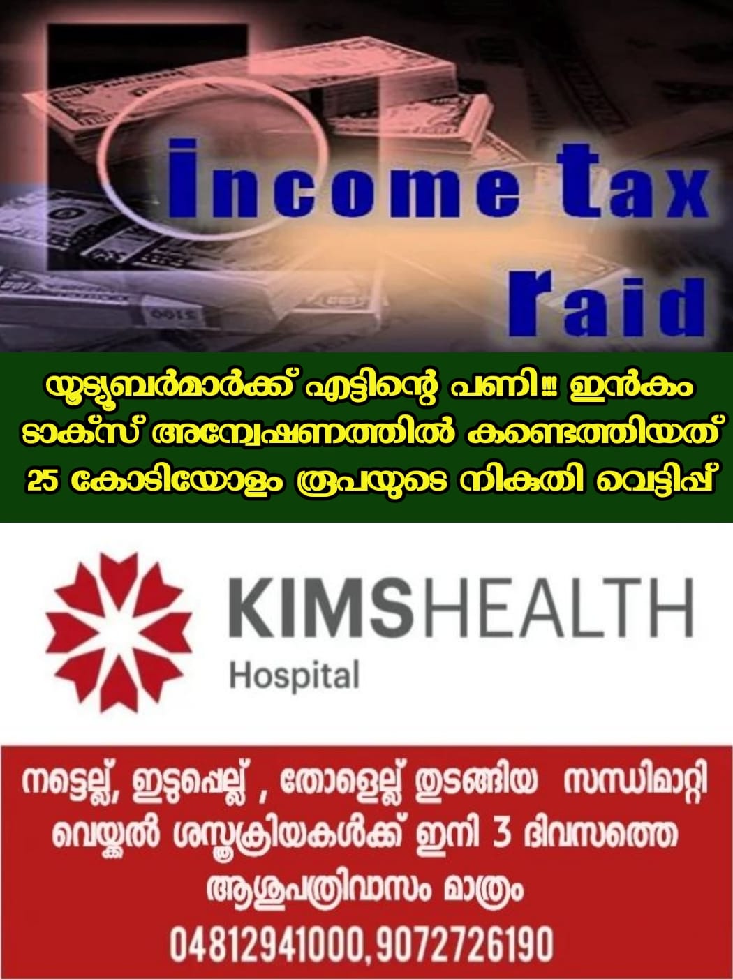 വരുമാനത്തിനനുസരിച്ച് കൃത്യമായി ആദായ നികുതിയൊടുക്കുന്നില്ല എന്ന കണ്ടെത്തലിലായിരുന്നു പരിശോധന. പ്രമുഖ യു ട്യൂബ് താരങ്ങളുടെ വീടുകളിലും പരിശോധന നടത്തി. യു ട്യൂബര്മാര്ക്ക് ലഭിക്കുന്ന അധിക വരുമാനത്തിന് നികുതിയൊടുക്കുന്നില്ല എന്നായിരുന്നു കണ്ടെത്തല്.
