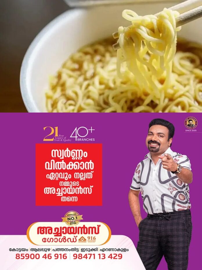കോട്ടയം: ഇന്നത്തെ തിരക്കിട്ട ജീവിതത്തില്, വിശക്കുമ്പോള് പെട്ടെന്ന് ഉണ്ടാക്കി കഴിക്കാൻ പറ്റുന്ന വിഭവങ്ങളില് മുൻപന്തിയിലാണ് ഇൻസ്റ്റന്റ് നൂഡില്സ്.