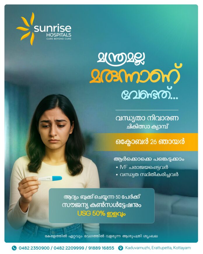 വന്ധ്യതാ ചികിത്സ ക്യാമ്പുമായി ഈരാറ്റുപേട്ട സൺറൈസ് ഹോസ്പിറ്റൽ; ഡോ. സുമി പീറ്റർ മറിയയുടെ സേവനം ഒക്ടോബർ 26, ഞായറാഴ്ച്ച രാവിലെ 10 മണി മുതൽ ലഭ്യമാണ്; വന്ധ്യതാ പ്രശ്നങ്ങൾ നേരിടുന്നവർക്കും ഐവിഎഫ് പരാജയപ്പെട്ടവർക്കുംക്യാമ്പിൽ പങ്കെടുക്കാവുന്നതാണ്; കൂടുതൽ വിവരങ്ങൾക്ക് ഫോൺ: 9188916859