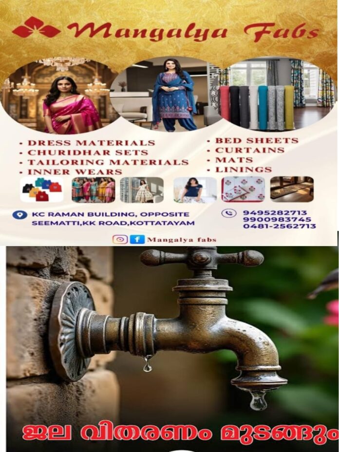 ട്രീറ്റ്മെന്റ് പ്ലാന്റിൽ മോട്ടോറുകളുടെ അറ്റകുറ്റപ്പണികൾ നടക്കുന്നതിനാൽ നാല് പഞ്ചായത്തുകളിലും മുനിസിപ്പാലിറ്റിയിലും 3 ദിവസം ജല വിതരണം മുടങ്ങും.